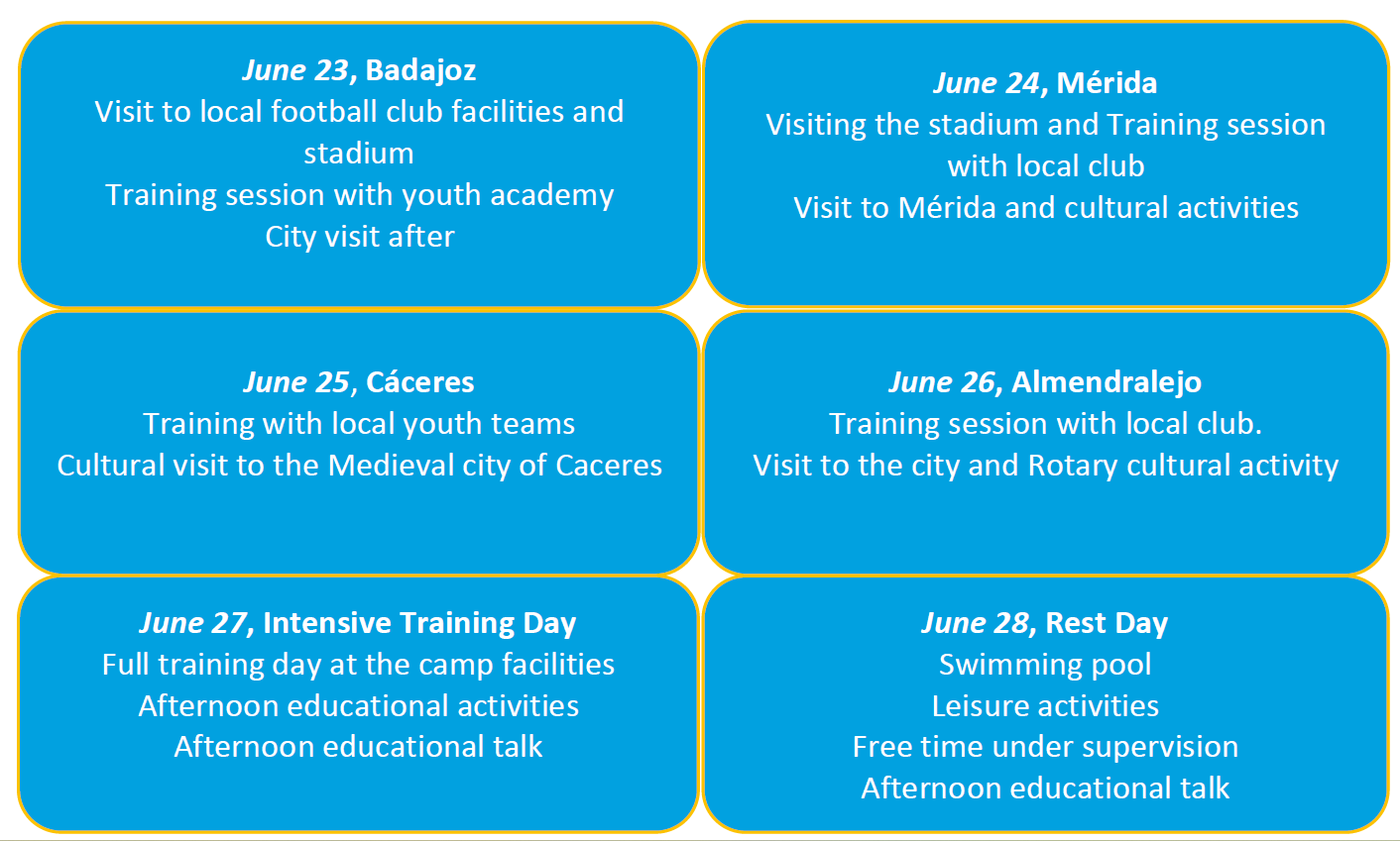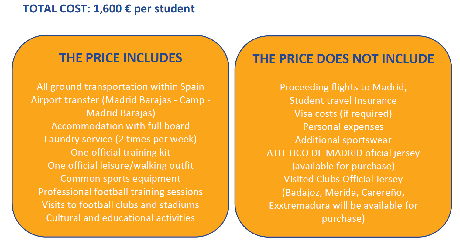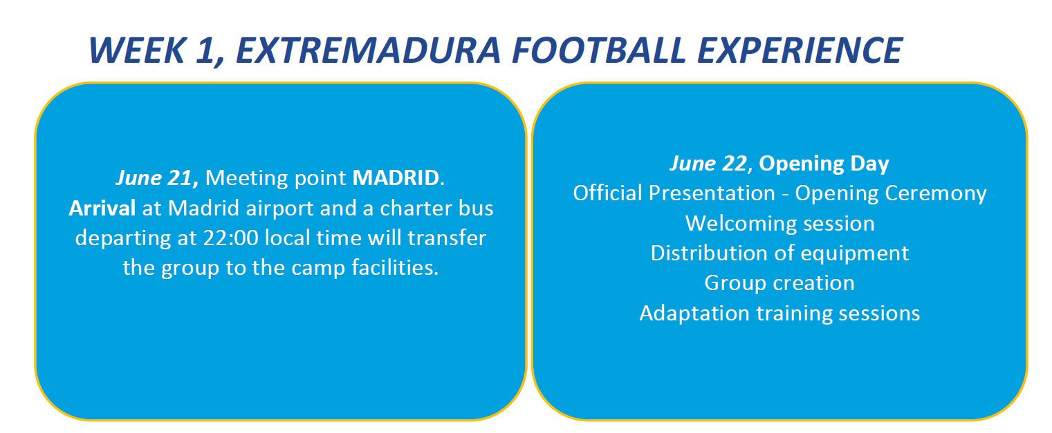 - Séances d'entraînement avec des clubs espagnols locaux (visites des villes voisines de Badajoz, Mérida, Cáceres et Almendralejo)