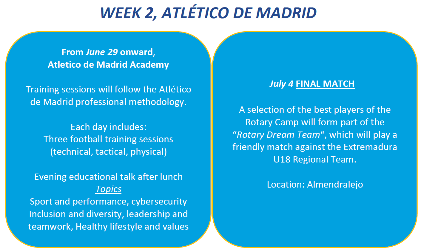Ce stage international de deux semaines est organisé par le Rotary Club Almendralejo D2201, en collaboration avec des partenaires sportifs professionnels et avec la participation exceptionnelle de l'Atlético de Madrid, l'un des plus grands clubs de football au monde.